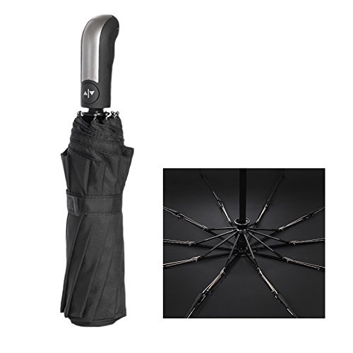 Studio : BigBoss Publisher : BigBoss Product Description A circle of shinning metal around the handle makes it easy to find the button to auto open and auto close the umbrella. Besides, the metal makes the handle stronger to hold. And it looks more stylish and more durable. AUTO OPEN CLOSE: No more struggling to push to open compared with traditional umbrella. Easy to operate with its finger pinch release mechanism in stormy days. SUPER WINDPROOF: Build strong to fight the wind. This umbrella is fortified with 10 reinforced fiberglass ribs. This windproof umbrella is durable enough to withstand powerful wind without turning inside out. COMPACT PORTABLE AND LIGHTWEIGHT: Shorter and easier carry. This reverse umbrella is easy to store in your car, your briefcases, backpacks, travel bags etc. It is perfect for travel, business, camping, fishing, and daily use. Package Includes: 1 x Umbrella 1 x Storage Pouch 0