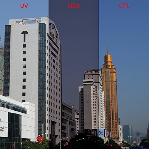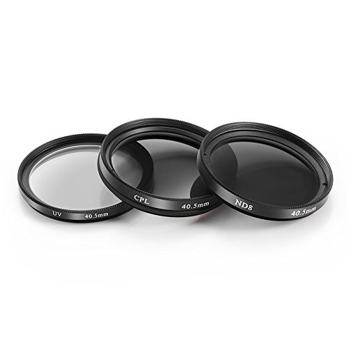 Kit includes: (3) 40.5mm Filters (UV + CPL + ND8) + (1)Filter Carrying Pouch. The filters are heat-treated and multi-coated for optimal quality and protect your lenses from dust and scratches