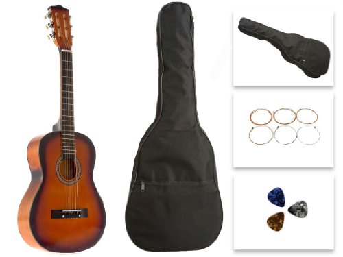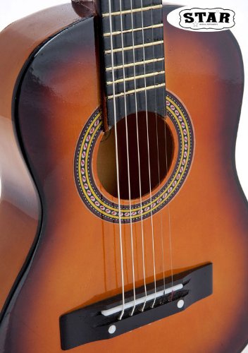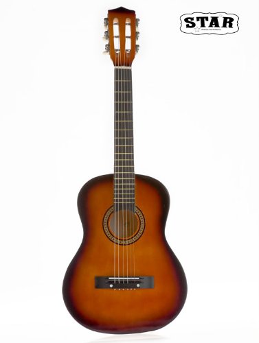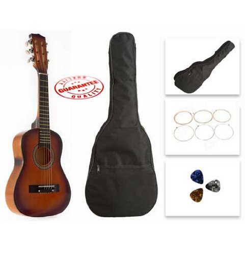 Studio : Sky Blue Telemarketing Inc. Publisher : Sky Blue Telemarketing Inc. Binding : Electronics Product Description This Kids Acoustic Toy Guitar 31 inches (1/4 size) is a unique introduction to playing for the aspiring young musician. It is a functional Acoustic Guitar, which is great for pretend to play. It offers not only great sound and playability, but an affordable price which is attractive to many first-time players seeking a beginner guitar. This Guitar is 31 inches in length and features a hardwood body, lindenwood binding, steel strings and 17 frets. Please note that this Guitar does NOT come tuned. To tune the Guitar, we recommend tightening the tuning knobs using a guitar tuner. This 31 inches Acoustic Guitar makes a great gift for kids and is a great value for the money. This guitar is everything your child needs to get started playing, includes Guitar Gig Bag, Strings Guitar Set Picks. 0
