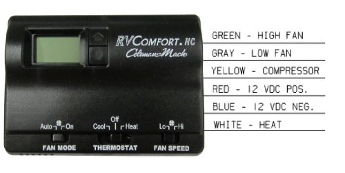 -. Feature : Rv Comfort (RVP) replacement Coleman Mach Black digital wall thermostat. / Single stage with heat/cool, hi/low and auto/on switches. / 12 volt/dc power.