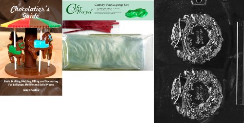 Cybrtrayd Seasons Greetings Wreath Chocolate Mold with Chocolatier's Bundle of 25 Cello Bags, 25 Red Twist Ties and Chocolatier's Guide