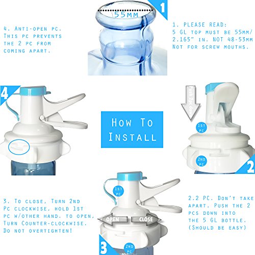 - ✔️ USER-FRIENDLY - Collapsible, portable, easy set up. Fits 3, 4, 5, 6 water bottle gallons/jugs. Hold the lever to pour water. Store it anywhere. 55MM crown top/mouth ONLY, Not 48mm. Not for threaded/screw tops.