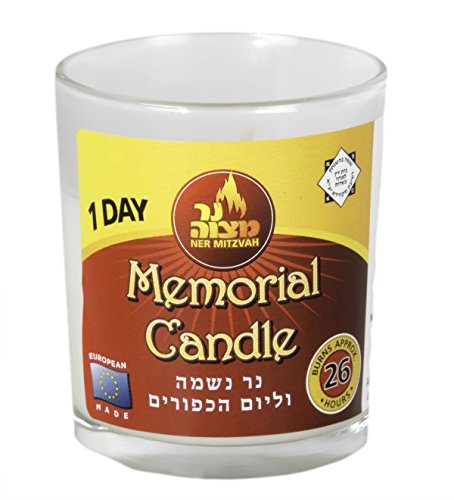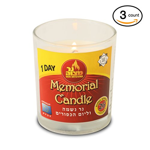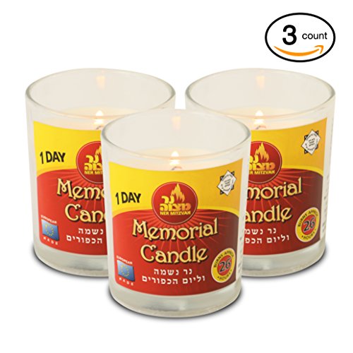 1 Day Yahrtzeit Candle - 3 Pack - 24 Hour Kosher Memorial and Yom Kippur Candle in Glass Jar - by Ner Mitzvah