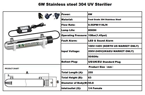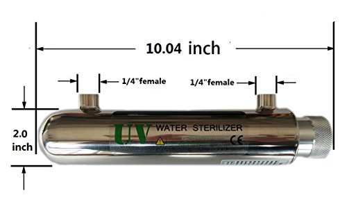 UltraViolet Water Disinfection System Stainless Steel 304 UV Sterilizer 0.5GPM with 6W (watt) Ultra violet Lamp, inlet/outlet Female 1/4 Inch, For Drinking Water RO System and More