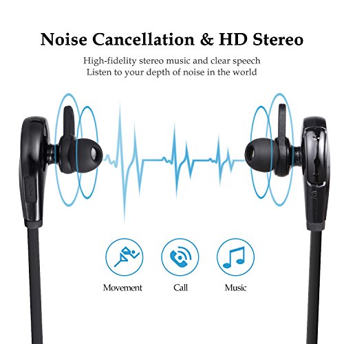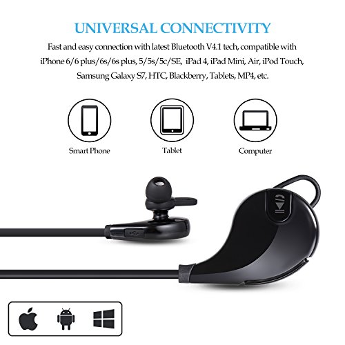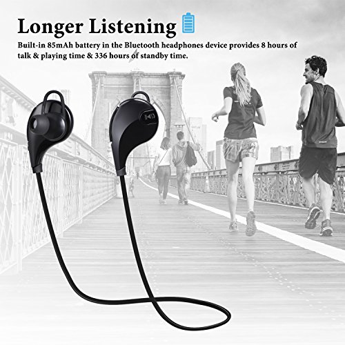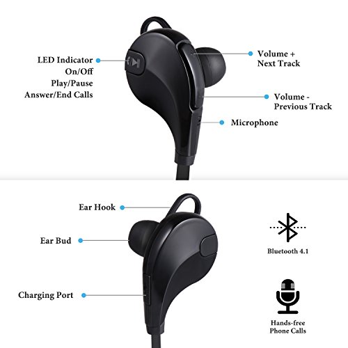 Feature : FIT SURPRISINGLY WELL The silicone ear tips are ultra soft, your ear canals will not feel stressed with them resting there, and the ear hooks adds to make earbuds stay in place, such sweatproof headphones with comfortable and secure fit are ideal to wear while working, walking, running, biking, etc. / GREAT SOUND, LOUDER VOLUME We¡¯ve applied optimized audio drivers and magnified the volume level, so our wireless headsets have that deep bass and louder volume, pleased mids and crisp highs also make the sound impressive. / CVC 6.0 NOISE REDUCTION TECHNOLOGY Active noise cancellation does muffle the surrounding noise outside, you can focus more on all the details in your call and listen to every beat of your music. / EXCELLENT WIRELESS CONNECTIVITY Bluetooth V4.1 is the latest technical, able to transfer data at top speed and work up to 33ft, compatible with two Bluetooth enabled devices simultaneously, compatible with iPhones, iPads, iPods, Android Smartphones. / LONGER PLAYTIME High capacity Li-ion battery provides max 7 hours of talking/listening, completely meet the needs throughout the day, and it only takes 1 hour to get fully charged.