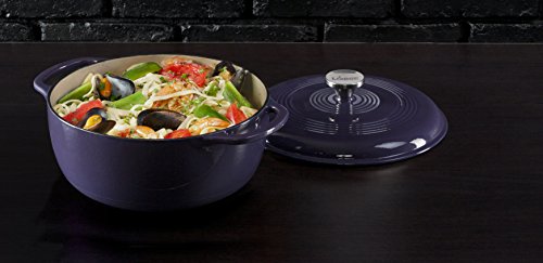 Studio : Lodge Publisher : Lodge Binding : Kitchen Product Description This 6-Quart enamel Dutch oven is great for cooking, marinating, refrigeration and freezing. The color porcelain enamel on cast iron can be used on gas, electric, ceramic and induction cooktops, as well as in the oven. Not recommended for use on outdoor grills or over open outdoor flames. Not for use in microwaves. Lodge Color Porcelain Enamel on Cast Iron cookware is cast from molten iron in individual sand molds. The porcelain surface eliminates the need to season cast iron. The cast iron vessel has superior heat distribution and retention, evenly heating bottom sidewalls and even the lid. Tightly fitting lid seals in moisture. The excellent heat retention reduces the amount of energy needed for cooking. Two layers of very hard, glossy porcelain enamel are chip resistant and easy to clean. Lid knob is oven safe to 500 degrees Fahrenheit. The black rim on the pot is matte porcelain, not exposed cast iron. Hygienic porcelain enamel is non-reactive with food. Although dishwasher safe, hand washing with warm soapy water is recommended to preserve the cookware's original appearance. 10 3/4" diameter, 4 1/2" deep. Purple. 0