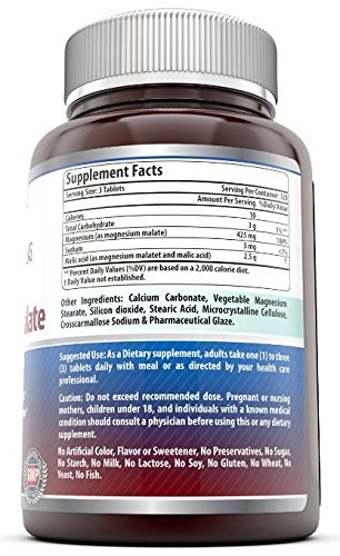 -. Binding : Health and Beauty -. Brand : Amazing Nutrition -. EAN : 0810180021319 -. Feature : OPTIMAL ABSORPTION A magnesium supplement might not be benificial to your body if you can't absorb the mineral and use it properly! Magnesium malate is relatively easier to absorb than other forms of magnesium / QUALITY GUARANTEED Our magnesium and malic acid tablets are produced in the United States in accordance with GMP guidelines, so you can be certain you're getting a magnesium with malic acid supplement that is as pure, potent and safe as possible / A MASSIVE DOSE OF MAGNESIUM Our potent supplement provides 426 milligrams of magnesium per tablet (1250 mg 3-tablet serving)! That's an optimal daily value needed based on a 2000-calorie diet / PERFECT FOR YOUR HEALTHY DIET Our magnesium with malic acid supplement is free of gluten, wheat, yeast, fish, lactose, milk, starch and sugar, making it an ideal addition to a healthy eating plan / MAGNESIUM & MORE In addition to magnesium, each magnesium malate 1250 mg gives you the benefits of malic acid, which is found in nearly every cell of the body. Malic acid and magnesium have been shown to complement each other's actions when taken together in the form of magnesium malate supplements -. IsAdultProduct : 0 -. Label : Amazing Nutrition -. Manufacturer : Amazing Nutrition -. PackageQuantity : 1 -. ProductGroup : Health and Beauty -. ProductTypeName : HEALTH_PERSONAL_CARE -. Publisher : Amazing Nutrition -. Studio : Amazing Nutrition -. Title : Amazing Nutrition Magnesium Malate 1250 Mg, 360 Tablets -. UPC : 810180021319