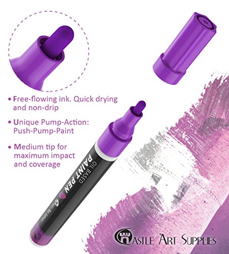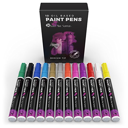 Castle Art Supplies, Paint Marker, Oil Based Pack of 12 Medium Point, Permanent Paint Pens in Assorted Colors, Weather Resistant non-drip quick drying oil paint pen suitable for multiple surfaces