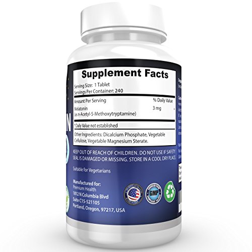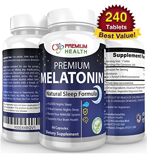 -. Binding : Health and Beauty -. Brand : Premium Health USA -. Color : white -. EAN : 0646437247030 -. Feature : ★ DO YOU SUFFER FROM INSOMNIA, SLEEP DEPRIVATION OR SIMPLY CAN'T GET A GOOD NIGHT'S SLEEP ? Give Premium Melatonin 3mg a try, you will not be disappointed! Our Premium Melatonin sleeping pills will help you sleep well and feel great in the morning! You should NOT feel any drowsiness or grogginess! / ★ TINY & EASY TO SWALLOW, SAFE & VERY EFFECTIVE TO HELP YOU SLEEP WELL ALL NIGHT & RELAX BEFORE BED: Enjoy a relaxing long sleep all night and feel refreshed in the morning. / ★ PREMIUM MELATONIN FOR A LONG RELAXING SLEEP: Our premium melatonin really does work and we are proud to say Premium Melatonin was made in the USA! Powerful and superb sleeping pills that can help fight off insomnia or if you simply cannot get to sleep at night our premium melatonin will help YOU. Enjoy a long relaxing sleep / ★ ALL NATURAL, DRUG FREE, NON-DROWSY WITH NO SIDE EFFECTS: You will feel refreshed and alert in the morning after a long relaxing sleep / ★ BEST 240 3mg PREMIUM SLEEPING PILLS: Enjoy a long, relaxing sleep WITHOUT feeling drowsy the next day! - Big Sale Now On with 240 tablets! -. IsAdultProduct : 0 -. Label : Premium Health USA -. Manufacturer : Premium Health USA -. ProductGroup : Health and Beauty -. ProductTypeName : HEALTH_PERSONAL_CARE -. Publisher : Premium Health USA -. Size : 240 -. Studio : Premium Health USA -. Title : #1 BEST Premium Melatonin 240 Tablets 3mg ( 8 MONTHS SUPPLY ) 100% All Natural Sleep Aid Helps You Get Good Night's Sleep Natural Sleeping Pills Helps Fight Off Insomnia Also Helps Brain Health -. UPC : 646437247030