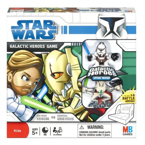 -. Binding : Toy -. Brand : Milton Bradley -. EAN : 0653569351047 -. Feature : Action-packed battle game lets you go head-to-head with Galactic Heroes figures / Use your cards wisely to prevail in an epic battle of good vs. evil. / Place your figures in the 3-D battle arena and then roll the die to move around the game board / Play your battle cards wisely to inflict damage points on your opponent / Star Wars fans will love this game. -. IsAdultProduct : 0 -. Label : Hasbro -. Manufacturer : Hasbro -. Model : 4492 -. MPN : 35104 -. PackageQuantity : 1 -. PartNumber : 35104 -. ProductGroup : Toy -. ProductTypeName : TOYS_AND_GAMES -. Publisher : Hasbro -. ReleaseDate : 2008-08-01 -. Studio : Hasbro -. Title : Star Wars Galactic Heroes Game OBI-WAN vs General Grievous -. UPC : 653569351047