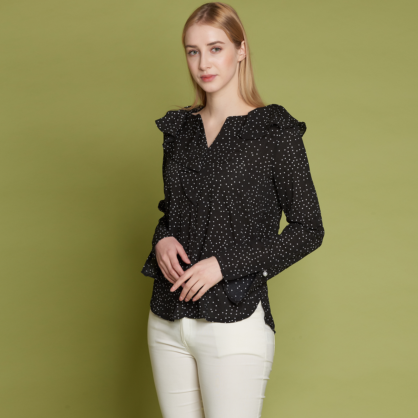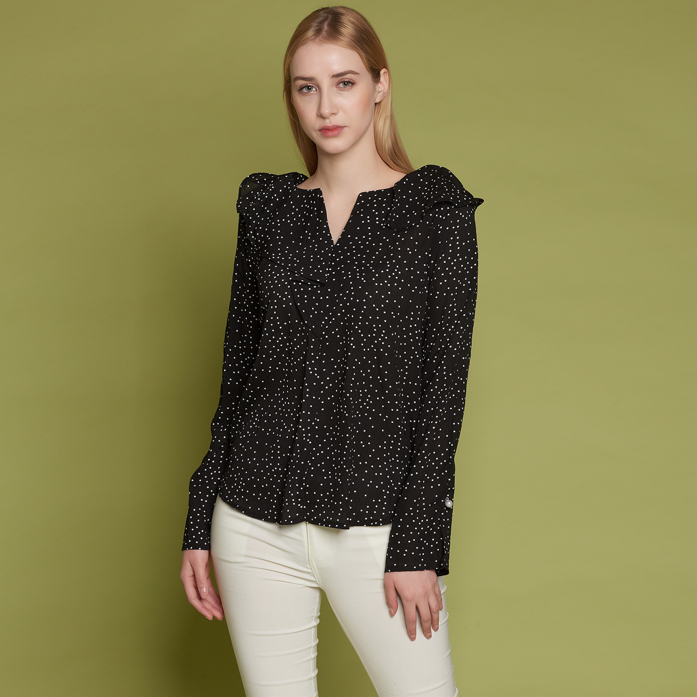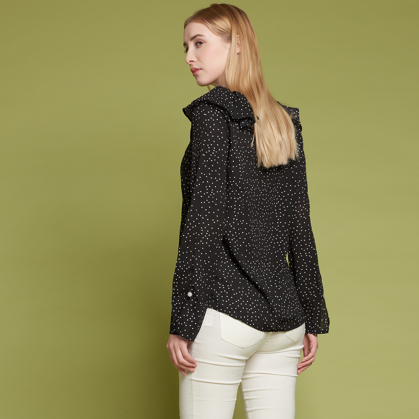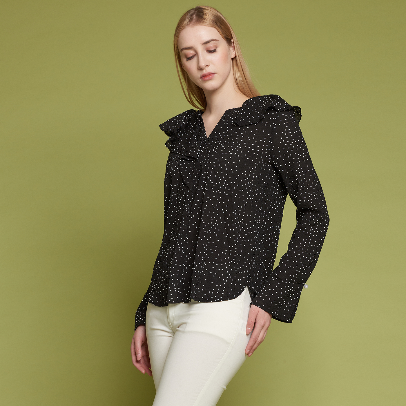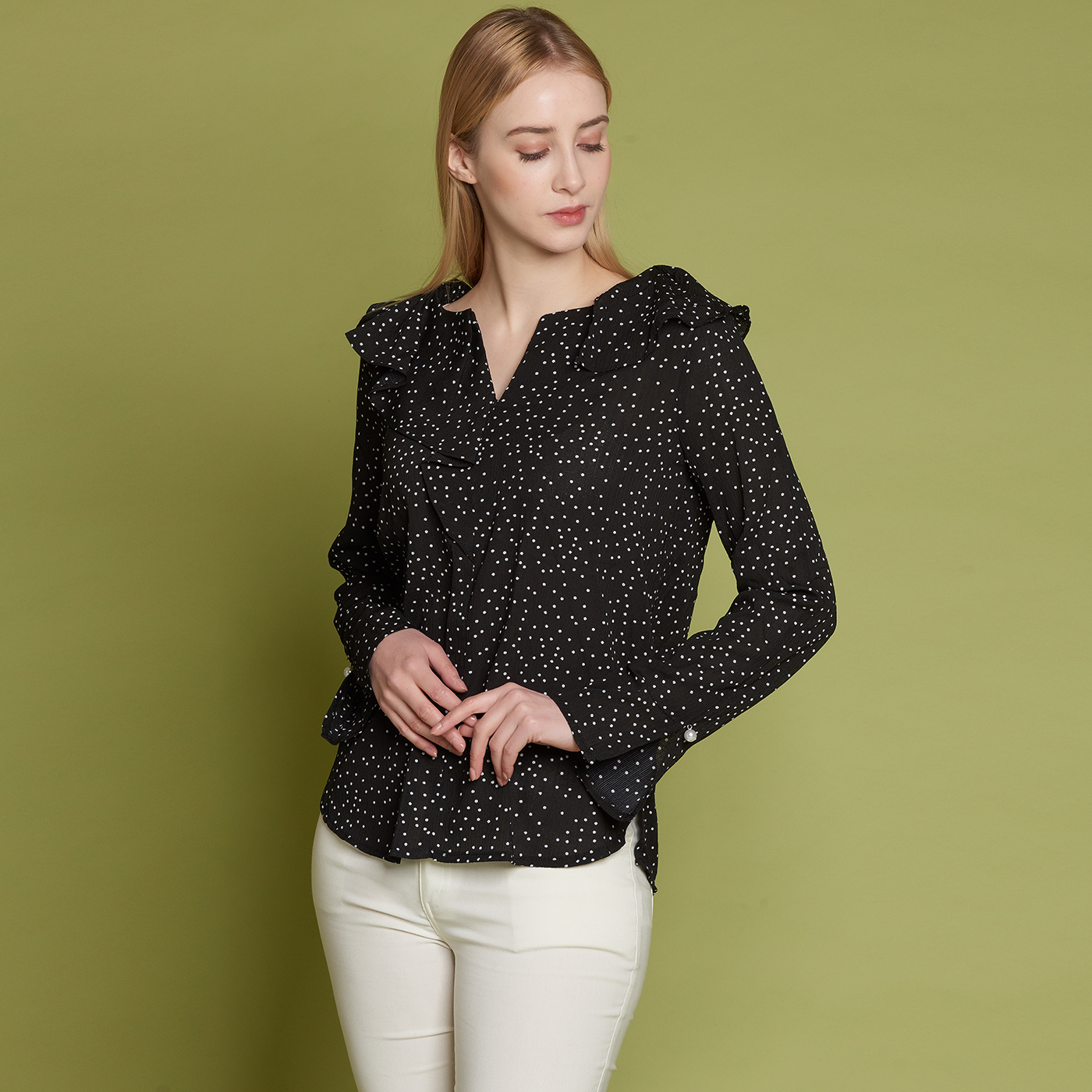 넥라인의 프릴 디테일과 소매디자인이 사랑스런 도트 패턴 블라우스입니다.