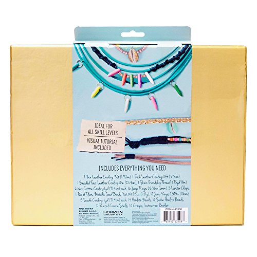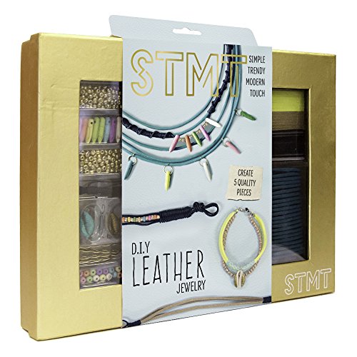 Explore various jewelry making techniques while creating trendy accessories with the STMT D.I.Y. Leather jewelry kit! weave, knot, and braid your way to an armful of leather bracelets or create a colorful statement necklace with spiked beads. The easy-to-follow instruction booklet includes 4 different jewelry designs to follow, but don't be afraid to get creative and come up with original designs! add a boho touch to your pieces by incorporating a Cowrie shell, or keep it classy and weave in some metallic seed beads. The STMT D.I.Y. Leather jewelry kit is ideal for the aspiring jewelry designer or lover of all things leather! kit includes: 5 ft. Thin leather cording – 11 ft. Thick leather cording – 10 in. Braided faux leather cord – 16 – 6 mm jump rings – 3 Lobster clasps (spelled wrong on packaging) – mini pliers – metallic seed beads – 10 – 10 mm jump rings – 2 – 1 Yd. Suede cords – 15 how lite beads – 10 spiked how lite beads – 2 painted Cowrie shells – 10 crimps – instruction booklet.Feature