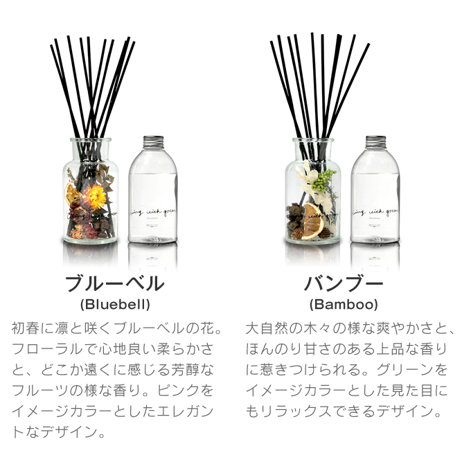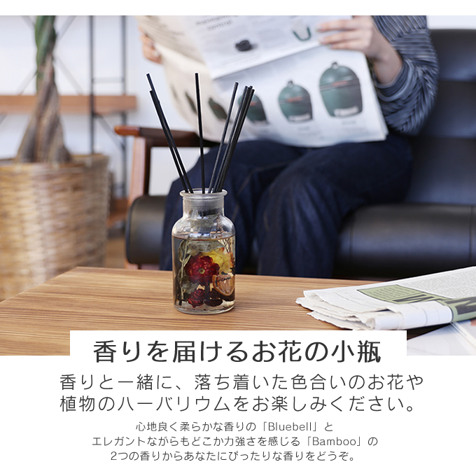 | ポイント | 香りを届けるお花の小瓶 香りと一緒に、落ち着いた色合いのお花や植物のハーバリウムをお楽しみください。 心地良く柔らかな香りの「Bluebell」とエレガントながらもどこか力強さを感じる「Bamboo」の 2つの香りからあなたにぴったりな香りをどうぞ。 |