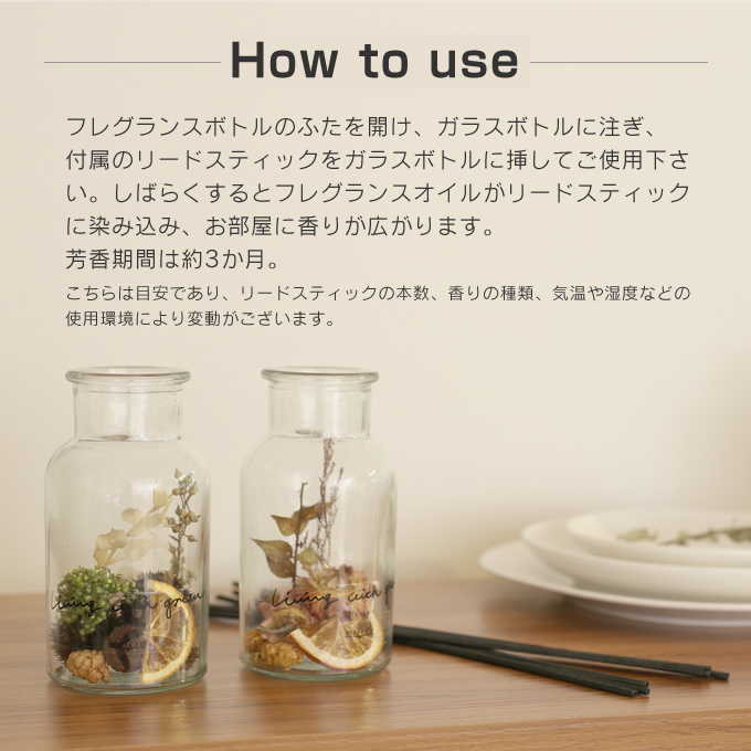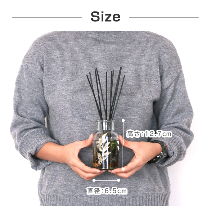 | セット内容 | ガラスボトル(ドライフラワー入)、香料ボトル、リード×10 |