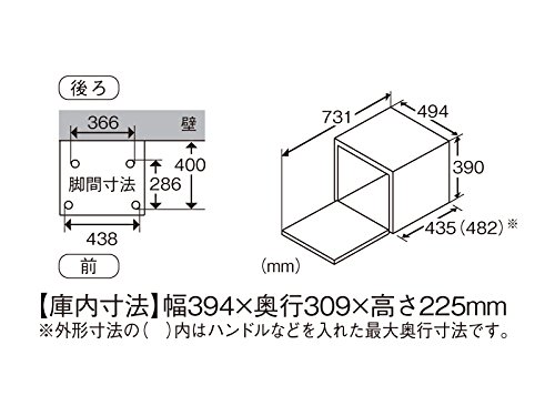 外形寸法:幅494×奥行435(※ハンドルなどを入れた最大奥行寸法:482mm、ドア開放時の奥行寸法:731mm※)×高さ390mm
