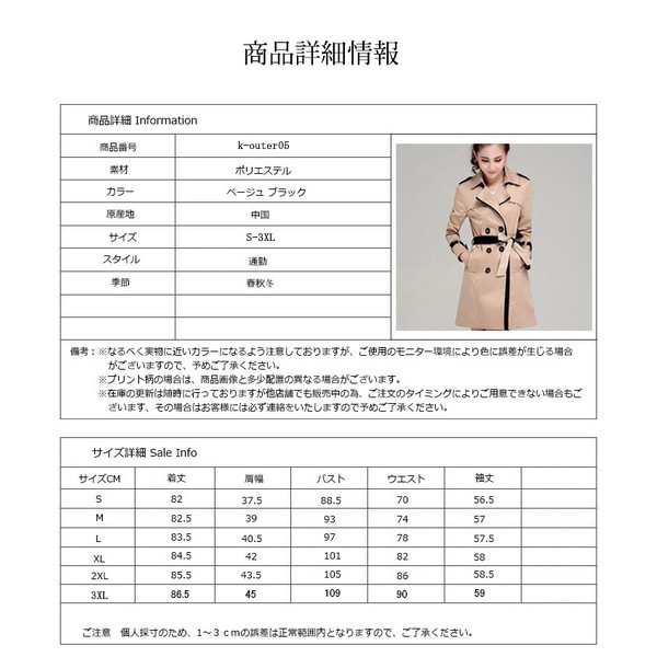 参考サイズ S/M/L/XL/2XL/3XL セット内容トレンチコート単品カラーブラック、カーキ(写真参考)素材ポリエステル商品説明 伸縮性:ややありサイズ感:普通生地の厚さ:普通