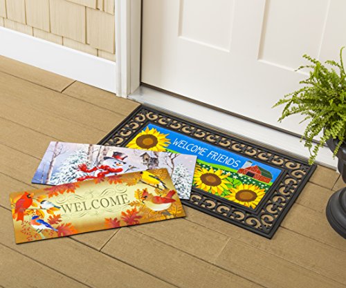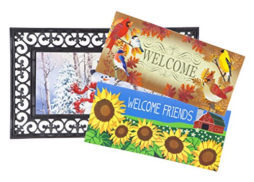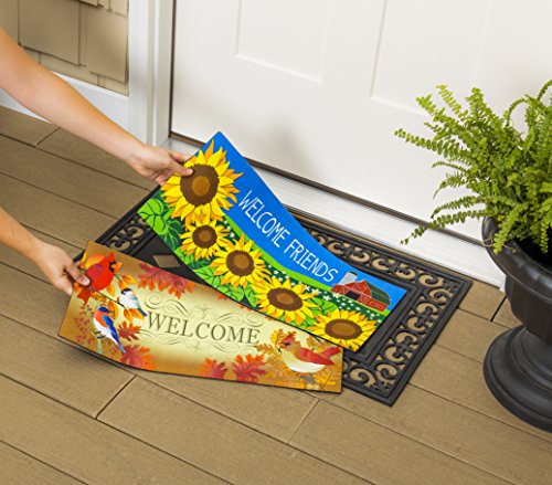 A doormat is a welcome addition to your home, greeting your friends and family. This seasonal, switchable insert is made for placement in Evergreen's Rubber Switch Doormat Frame. This set of inserts are made of rubber and features a heat-sublimated design. The mat is mildew resistant, and features a skid-resistant backing to help keep the mat in place. Each insert measures approximately 10 inches wide and 22 inches long and is safe for indoor or outdoor use. The mat tray is also made of recycled rubber that is mildew resistant. The tray measures approximately 18 x 30 inches and fits one insert at a time. For stains, simply spot clean with soap and warm water. This set includes 2 seasonally appropriate mat inserts and a mat frame to hold them to display all year.Feature