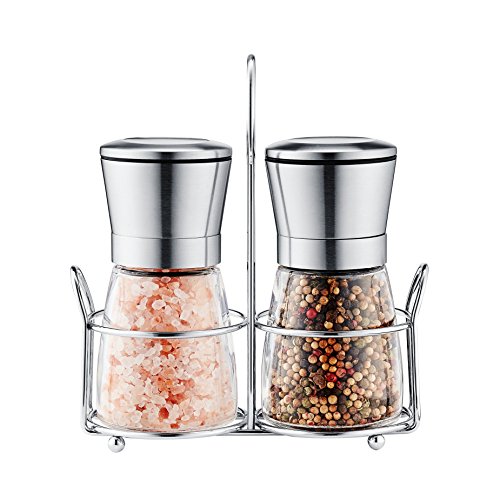 Premium Stainless Steel Salt and Pepper Grinders with Matching Stand- Salt and Pepper Glass Shakers - Spice Grinder with Adjustable Coarseness
