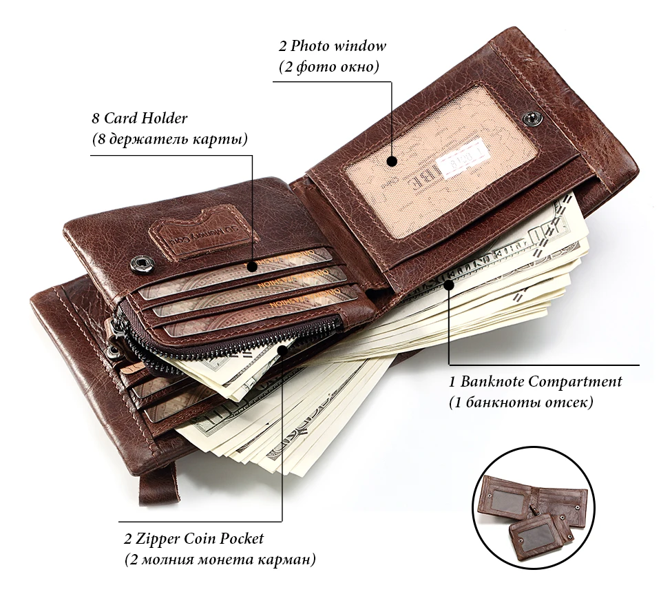 Interior:Photo Holder,Interior Zipper Pocket,Zipper Poucht,Coin Pocket,Interior Compartment,Interior Slot Pocket,Note Compartment,Card Holder
