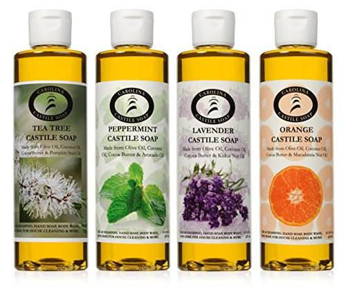 1 each of Tea Tree Castile Soap, Lavender Castile 1 each of Tea Tree Castile Soap, Lavender Castile Soap, Peppermint Castile Soap, & Orange Castile SoapMade from Organic Olive Oil, Organic Coconut Oil, Kukui Nut Oil, and Fair Trade Organic Cocoa Butter. Great for use as a body wash, shampoo, shaving soap, dish soap, house cleaning, and laundry soap. More skin loving Olive Oil content than any other major Castile Soap brand.Feature