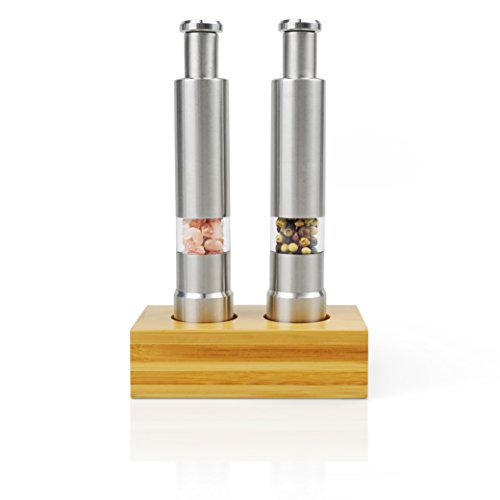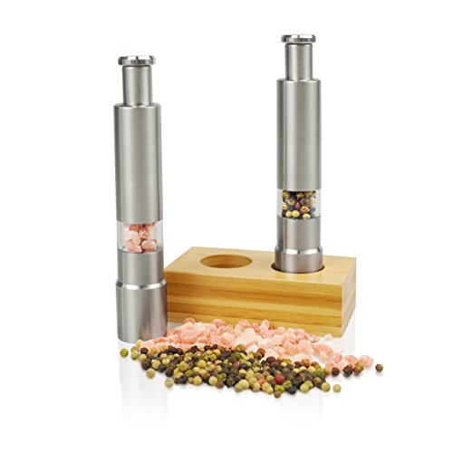 Salt and Pepper Grinder Set with Wood Stand - Wooden Bamboo Stand Designer Base With Easy Pump and Grind Salt and Pepper Shaker Set Stainless Steel