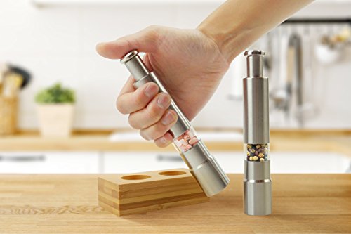 Sleek and Durable - High quality stainless steel salt and pepper grinder set with a sleek bamboo stand.