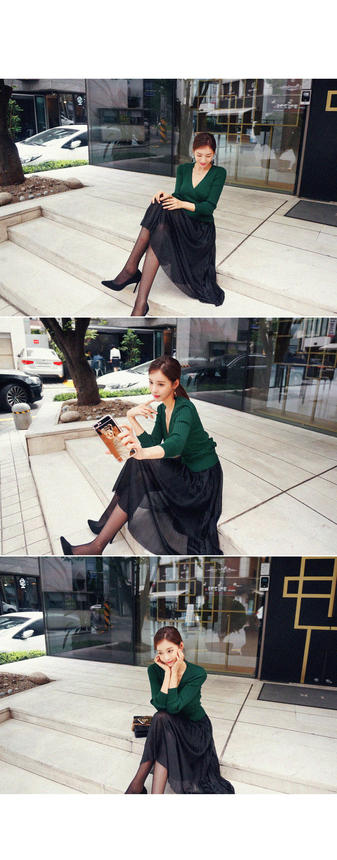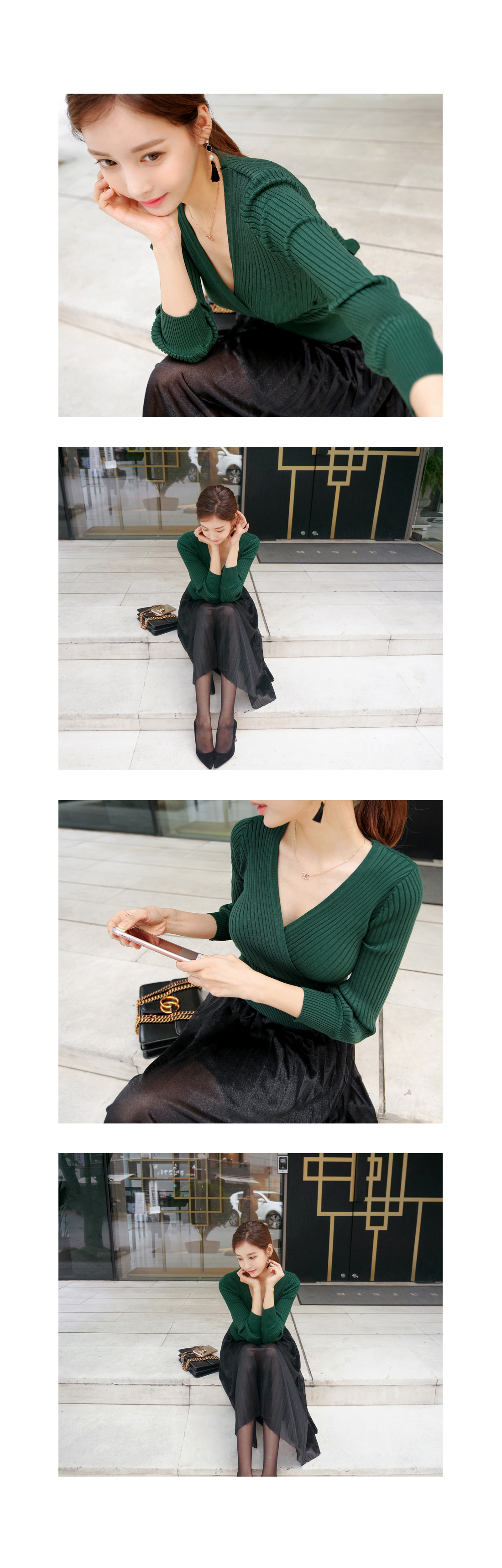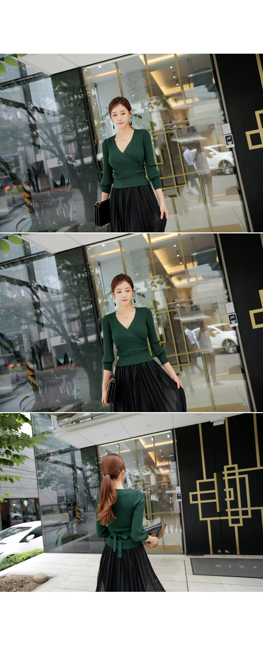 골지 짜임의 랩 디자인으로 제작된 니트탑과