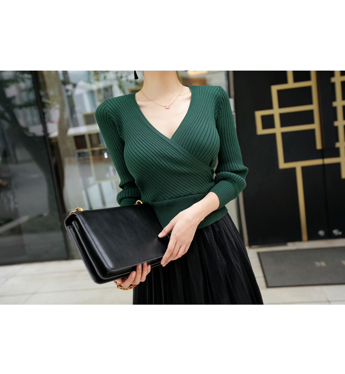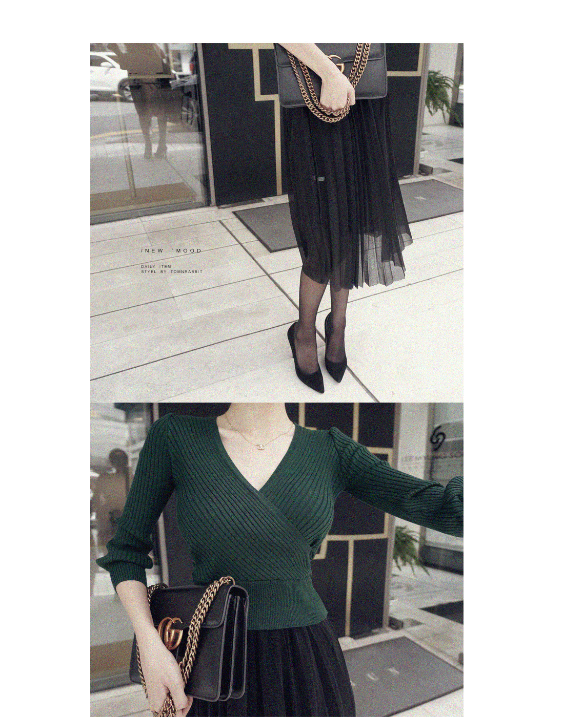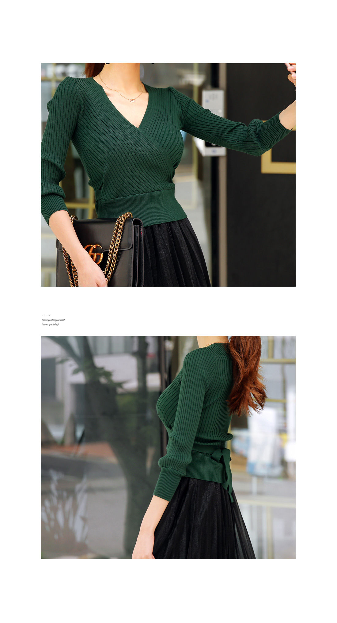 골지 짜임의 랩 디자인으로 제작된 니트탑과