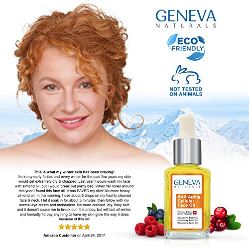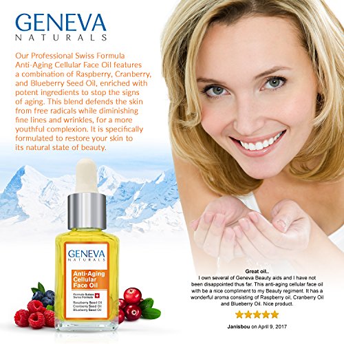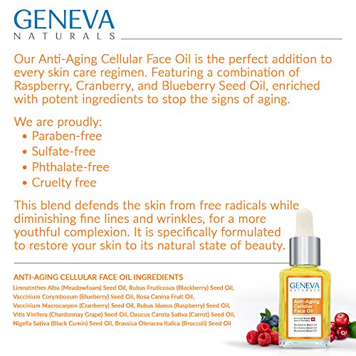 -. Binding : Misc. -. Brand : Geneva Naturals -. EAN : 0649823879075 -. Feature : NATURAL SWISS FORMULA - Geneva Naturals uses a proP.R.Ietary Swiss Formula that stimulates cell regeneration and defends the skin from free radicals while diminishing fine lines and wrinkles. / SWISS DERMATOLOGIST APPROVED - All Geneva Naturals skincare products have been thoroughly tested and approved by leading Swiss Dermatologists. / FEATURED IN ALLURE MAGAZINE - "Achieve glowing radiant skin with Geneva Naturals luxurious yet affordable collection." (January issue) / HIGHEST QUALITY - We use the highest quality Seed Oils available in our formula. Perfect for anyone serious about taking care of their skin! We are proudly paraben-free, sulfate-free, phthalate-free & cruelty free. -. IsAdultProduct : 0 -. Label : Geneva Naturals -. Manufacturer : Geneva Naturals -. MPN : 649823879075 -. PartNumber : 649823879075 -. ProductGroup : Beauty -. ProductTypeName : BEAUTY -. Publisher : Geneva Naturals -. Studio : Geneva Naturals -. Title : Cellular Face Oil - All Natural Swiss Anti-Aging Formula with Black Seed Oil, Raspberry, and Blueberry Seed Oil for Men and Women - 1oz -. UPC : 649823879075
