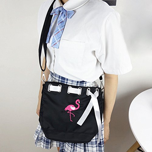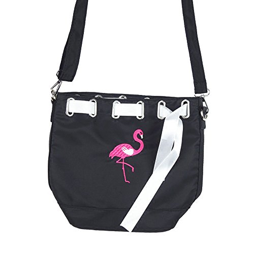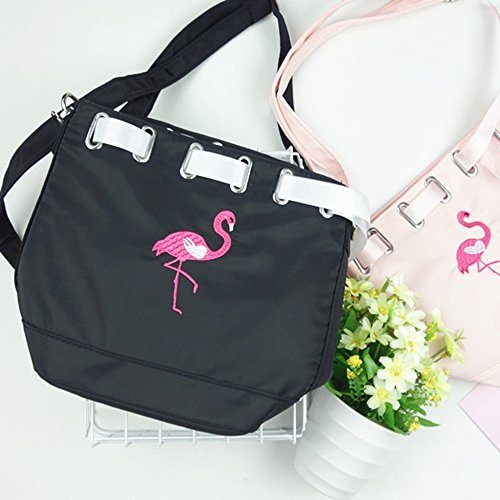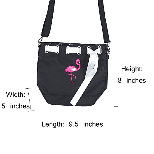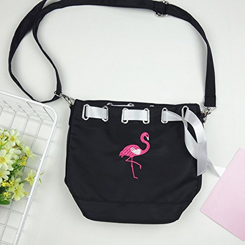 -. Brand : FLYING BALLOON -. Color : Black -. Department : womens -. EAN : 7801230818150 -. Feature : Material: Nylon. / Feature: The crossbody bag features with the embroidery of the flamingo pattern, ribbon perforated and can be used in many occasions. / It's the perfect gift for your friends. / This backpack is suitable for school, traveling, and shopping. / Size: 9.5(L) x 5(W) x 8(H) inches. -. ProductGroup : Shoes -. ProductTypeName : HANDBAG -. Title : FLYING BALLOON Elegant Embroidery Flamingo Shape with Ribbon Perforated Nylon Crossbody Bags Bucket Bags Shoulder Bags for Women, Black