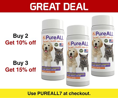 -. Feature : ✔ PREVENTATIVE AND THERAPEUTIC care for cats and dogs: All-In-One nutritional formula works to ease pain and aging symp in older pets and to help prevent health issues in younger pets; Anti-inflammatory and probiotics for cats and dogs relieve hip and joint pain; Probiotics and enzymes relieve diarrhea and indigestion; Vitamins, minerals and antioxidants relieve itching, scratching and shedding. BUY TWO, Get 10% OFF. BUY 3 or more, Get 15% OFF. Use promotion code PUREALL9 at checkout. / ✔ SUPPORTS HEALTHY IMMUNE SYSTEM: Our all-in-one formula supports your furry friend's immune system and protects against free radical damage with fresh live probiotics; Safe to use everyday with clearly labeled expiration date/lot number; Helps speed recovery for dogs and cats that have undergone recent antibiotic, allergy, surgical or steroid treatments by bolstering their immune systems. / ✔ IMPROVES SKIN AND COAT: Our dog and cat pet supplements provide the nutrients needed to support a healthy skin and coat including; Vitamin D, Vitamin C, Vitamin E, Niacin, Iodine and Calcium and antioxidants such as organic blueberries, kelp, and garlic; Relieves dry, shedding, itchy skin and helps retain natural oils for a glossy, shiny coat. / ✔ HEALTHY DIGESTION AND GUT HEALTH: Simien PureAll Pet Supplements contains key digestive enzymes for cats and dogs which aid in proper digestion and gut health; Our all-natural formula works great for adult dogs and cats but is also gentle enough for puppies and kittens. Can also improve cat and dog UTI or urinary tract infection. / ✔ TRUST AND REPUTATION: Our formula is tried and true and has been manufactured for the last 35 years with no FDA issues or recalls; Simien PureAll sources only the best all-natural ingredients; Made in the USA, FDA certified, produced in a GMP facility, third party tested for purity and Vet approved. Your fur babies deserve a healthy, active, and long life. Click the ADD TO CART button to invest in your pet's health.