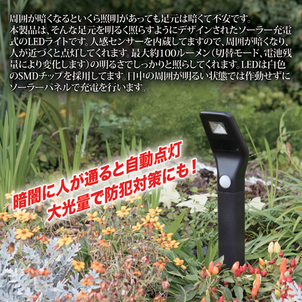 ●本製品は、そんな足元を明るく照らすようにデザインされたソーラー充電式のLEDライトです。