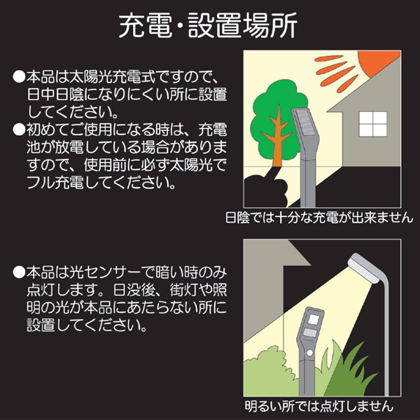 ●日中の周囲が明るい状態では作動せずに、ソーラーパネルで充電を行います。