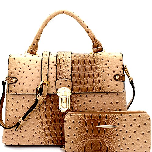 -. Title : New! Le Miel Ostrich Embossed Push-Lock Flap Satchel w/ Strap + Wallet- Stone