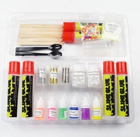 ? The kit contains: 1) Plastic beads ? The key ingredient for Floam 2) Glue ? 300ml of clear non-toxic glue (the main ingredient in slime) 3) Coloring solutions ? 6 different colors (enough to make any slime you want.) 4) Glitter powder ? 3 sparkling colors to make shiny and glittery slime 5) Borax? 2 containers to turn your glue into slime 6) Glow in the dark powder (makes terrific glow in the dark slime!) 7) Full instructions ? Easy to follow recipe (the safety instructions and the kit should always be used under adult supervision) 0 |