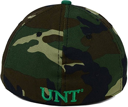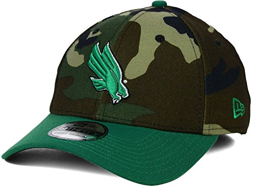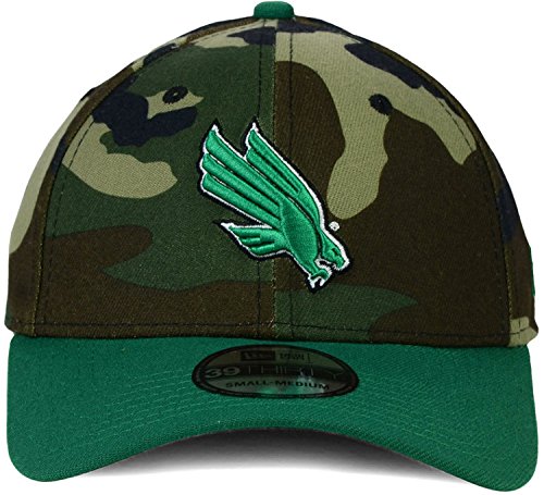 North Texas Mean Green UNT League Classic Camo New Era 39Thirty NCAA Stretch Fit Hat Cap. This flex fitted cap features an embroidered Eagles logo on front, stitched New Era® flag at wearer's left side, camo crown, team color visor and embroidered alternate team logo on the rear. Interior includes branded taping as well as a moisture absorbing sweatband. Stretch fit on closed back. Officially licensed.Feature