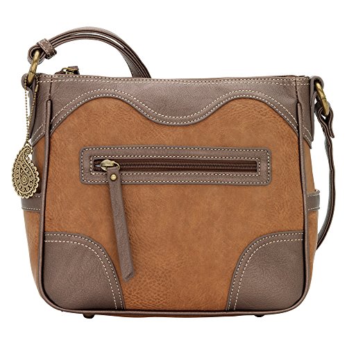 This organizer bag has a long adjustable shoulder strap so it can be worn conveniently as a crossbody. You will also find this bag has 2 side open pockets, a front zip pocket; a hidden back wall compartment is designed for concealed carry with zipper openings on both sides. The body of the bag is made of a soft, man-made leather trimmed with a metallic material that is accented with two rows of decorative stitching.