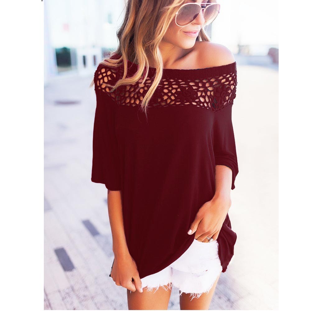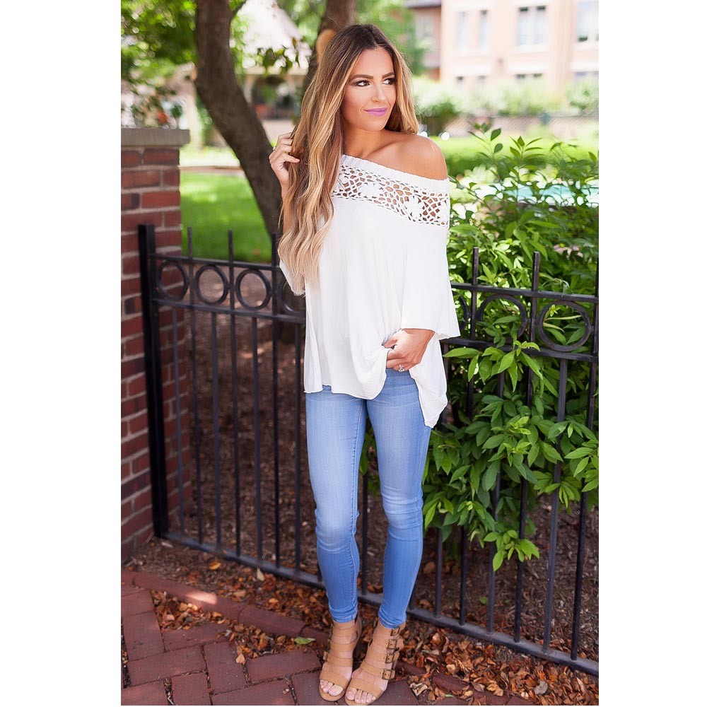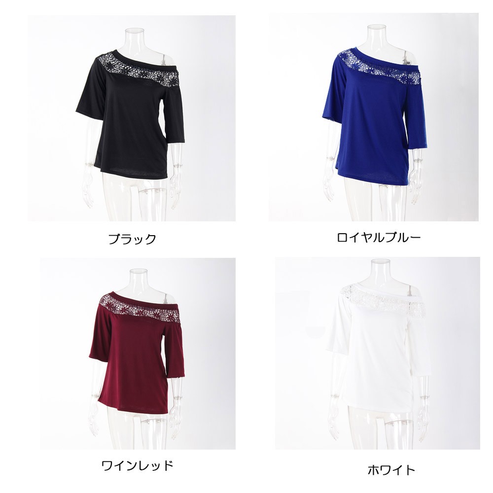 シンプルな無地生地に花柄レースが大人の抜け感を醸し出すオフショルトップス