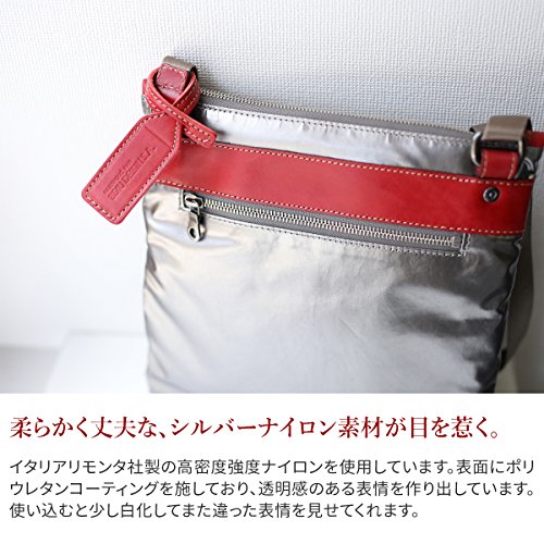 -. Feature : 外寸:縦24cm×横(開口部)20.5cm、横(開口部)25cm×まち1.5cm ・内寸:縦23cm×横(開口部)19.5cm、横(開口部)24cm×まち1cm / 重さ:250g ・ショルダーベルト:67cm~127cmの間で調節可能。(幅2cm) ・収納書類サイズ:A5 ・メイン開口部:ファスナー / 外ポケット:ファスナー×2ヶ所 ・内ポケット:ファスナー×1ヶ所、オープン×2ヶ所 / 表素材: リモンタ ナイロン シルバー×ヌメ アンティック ◇手ざわり: 柔 ■□□□□ 硬 (※表記は目安です)  ・裏地: 有り(ナイロン) / MADE IN JAPAN(日本製)