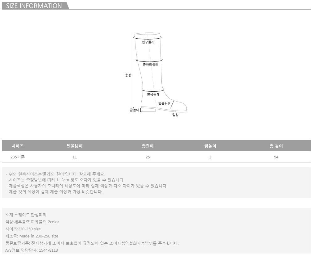 배색 롱 부츠#84942MD COMMENT고급스러운 롱 부츠를 소개할께요~적당한 굽높이로 편안 착화감과 스타일리시한 디자인으로멋스러워 하나쯤 꼭 소장해야할 필수 아이템이에요 :)세련된 배색 디테일로 밋밋 하지않아 더 좋은 롱 부츠따듯하고 편안한 롱부츠를 찾으시는 분들께 추천드려요~COLOR,SIZE TIP컬러는 세무블랙, 피유블랙 2color로 구성되어 있으며, 모델의 착용 컬러는 피유블랙 / 235 입니다.