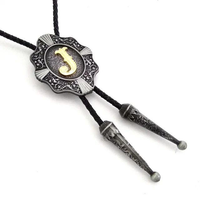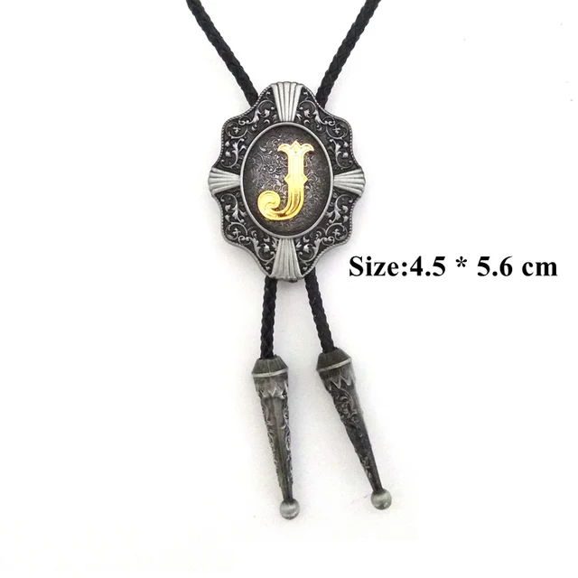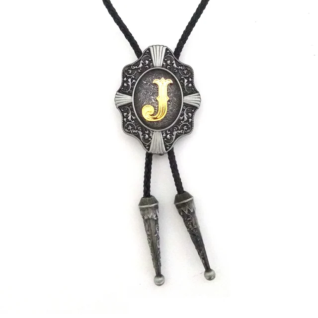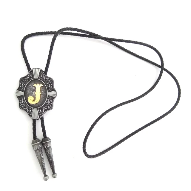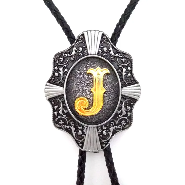 | [해외]웨스턴 카우보이 볼로 타이 Balck의 PU 가죽 금속 버클 골드 편지 "J" 소매 도매 정의 볼로 타이 |