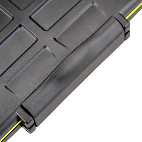 -. Feature : Tough water-resistant polycarbonate case for carrying memory cards / Each slot is strictly tailored to fit the card perfectly / Two sides both allow you store memory cards / Ergonomic locking system and has a hole for easy carrying / Fits for 12XSD cards,12X Micro SD Cards