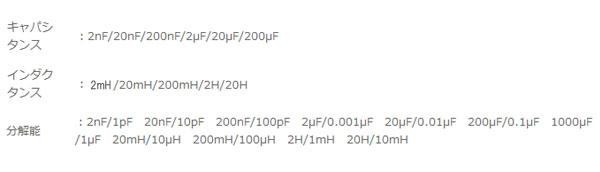 | 仕様 | 電源:006P(DC9V)×1 測定周波数:250Hz インダクタンス キャパシタンス 抵抗:200Ω/2kΩ/20kΩ/200kΩ/2MΩ/20MΩ |