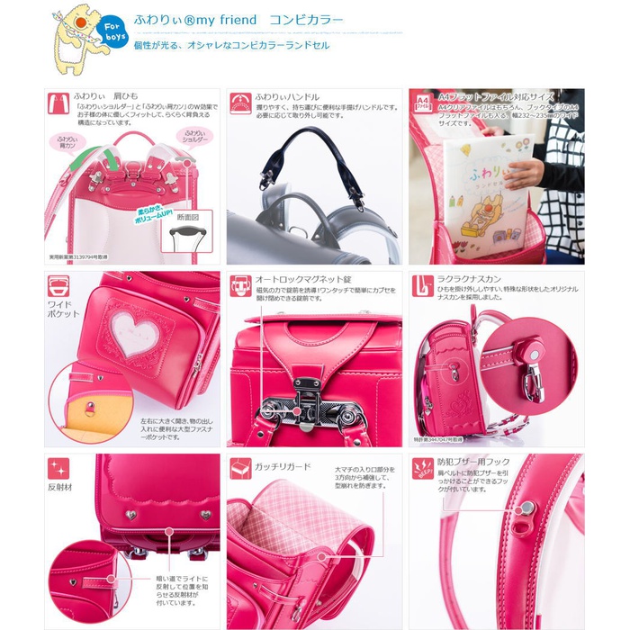 원본상품명: ふわりぃ my friend コンビカラ?ランドセル?量1,030g個性が光るデザイン A4フラットファイル?? ワイドモデル クラリ?ノF 男の子カラ?選べる2色♪ 2018年モデル
