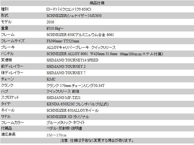 商品名:SCHNEIZERシュナイザー MU650 適応身長 : 150cm~170cm 車体色 :ホワイト・ブルーメタリック 付属品 : 50mmステム・ペダル・反射板・取扱説明書 *仕様は変更することがあります。