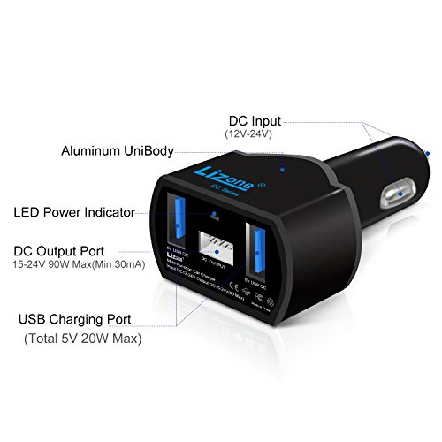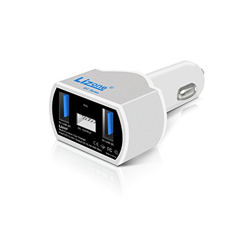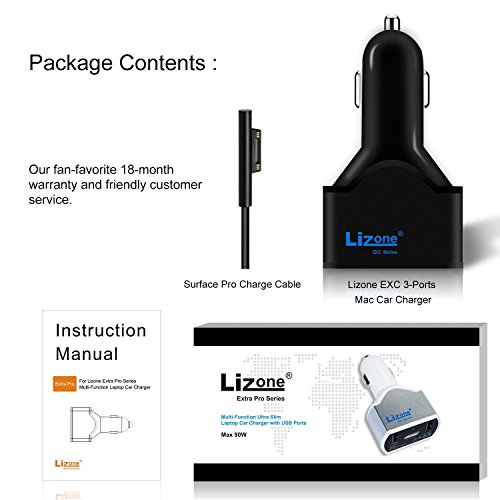 -. Feature : Exclusive Lizone QC Technology: Detects your device to deliver its fastest possible charge speed up to 4.5 amps with the DC Port and up to 3 amps per USB port or 4.2 amps through two ports. / High Power: Full speed Charges the Microsoft Surface Pro3/Pro4/Book(included Surface Pro Charge Calbe) and iPad iPhone and Samsung Galaxy Note... Safely recharges with a 2 amp or higher output charger (please note most phone chargers only have 1 amp). / Incredibly Compact: The size of a small candy bar (3.1 × 1.8 × 1 inch, 5oz ) it fits perfectly in your car or pocket. / The Lizone Advantage: Join the 5 million+ powered by our leading technology. 5 Ports Compatible with Surface Pro3/Pro4 Surface Book(included Surface Pro Charge Calbe) Apple and Android smartphones(All), tablets(All) and other USB-charged devices except for the iPod, HP TouchPad, Dell Venue 11 Pro, Asus tablets and some GPS and Bluetooth devices. / Package Contents : Lizone EXC 3-Ports Car Charger, Surface Pro Charge Calbe, Instruction Manual, our fan-favorite 18-month warranty and friendly customer service.