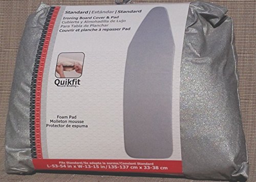 -. Binding : Kitchen -. Brand : Ironing Board Covers -. Color : Gray -. EAN : 0616183101641 -. Feature : his sleekly silver cover and pad is coated in silicone to provide an extra measure of protection against scorching and stains; it rewards the careful and forgives the distracted. It is bling for your ironing board. / ONE-PIECE CONSTRUCTION. Silicone coated cover for scortch, stain, and moisture resistance and extra durability. / Thick 6mm foam pad and100% cotton cover for a smooth ironing surface. Attached storage pocket. Tailored nose and bungee cord binding enhance fit and makes installation easy. / Cut full size to fit all standard 13" to 15" x 53" to 54" tops. -. Label : Ironing Board Covers -. Manufacturer : Ironing Board Covers -. Model : KFP001 -. MPN : LE -. PartNumber : LE -. ProductGroup : Home -. ProductTypeName : HOME -. Publisher : Ironing Board Covers -. Size : Cut full size to fit all standard 13" to 15" x 53" to 54" tops. -. Studio : Ironing Board Covers -. Title : Household Essentials Silver Silicone Ironing Board Cover and Pad -. UPC : 616183101641