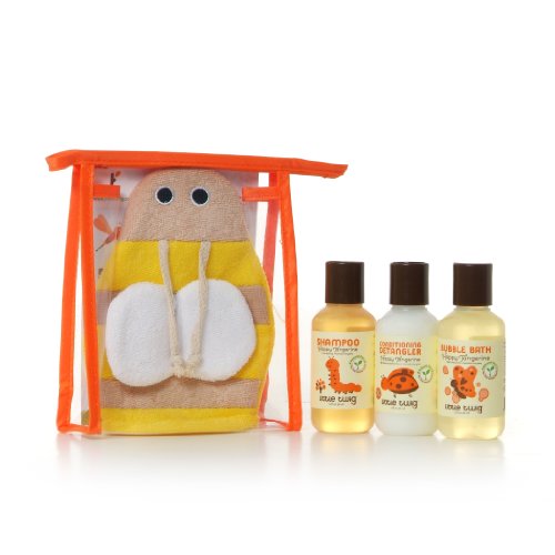 Little Twig's natural fruit and flower essences and blends of tangerine, lemon and rosemary are guaranteed to make the whole family happy. Happy Tangerine's light and lively fragrance rejuvenates the senses while replenishing moisture and nutrients to young skin. Your baby will look and feel amazingly soft and deliciously spoiled! Little Twig's Travel Basics Set is the perfect companion for a family on the go. The Little Twig Travel Basics Happy Tangerine Bumble Bee Set includes one terry cloth Bumble Bee Bath Mitt and Happy Tangerine scented Bubble Bath, Shampoo and Conditioning-Detangler, in 2 ounce travel sizes. What's more fun than a tub full of fruity flowery bubbles? Little Twig's Happy Tangerine Bubble Bath's uplifting scent is sure to please both parent and baby. Vitamins B and E combined with jojoba and sunflower oil soothe and soften skin during bath playtime. Little Twig's Baby Shampoo is free of synthetic fragrances and irritants, our mild lather is sure to keep little ones laughing. Like our entire Little Twig products, our natural ingredient based shampoo was developed to nurture young scalps and hair. The Little Twig Conditioning-Detangler can be left-in or rinsed-out, and our conditioning formula will tame the wildest of curls. This detangler will smooth and protect delicate hair, leaving little heads smelling clean, fresh - and happy! Children mean the world to us and the world means everything to our children. Our mission at Little Twig is to provide families with the safest and most natural bath time alternative. We use only the most effective natural botanical ingredients in all of our Little Twig products for pure and gentle personal care. Our commitment to natural care for the whole family makes our world a healthier, happier place, one tub at a time.Feature