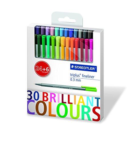 #1 Best Seller in Pens for Coloring Books for Grown-Ups: Staedtler Deluxe 24 + 6 Piece Triplus Fineliner Pens, 3mm, Metal Clad Tip, total of 30 Pc Color/PK, Assorted. 30 fine-line pens in vibrant colors. Non-smudging, water-based ink which is formulated to sustain a long cap-off time. Fineliner in ergonomic triangular shape for relaxed and easy writing. DRY SAFE - can be left uncapped for days without drying up.