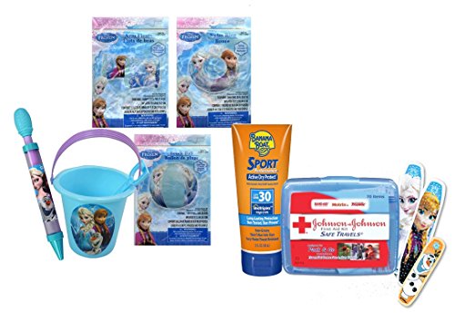 -. Feature : Frozen 8pc Grab & Go Summer Fun Set Includes the following: / (1) Frozen Swim Ring (1) Frozen Beach Ball (1)Frozen Arm Floaties / (1) Frozen Pail (1) Shovel (1) Frozen Water Blaster Squirt Gun / (1) Plus Bonus JOHNSON & JOHNSON First Aid To Go Kit - Includes: 4 Frozen Band-Aid Brand Adhesive Bandages( Assorted Characters), 2 cleansing wipes; 4 First Aid Gauze Pads, 6 Flexible Fabric Adhesive Bandages & 1 Durable Plastic Case. / Banana Boat Sport Sunscreen SPF 30, 1 Fl Oz Travel Size